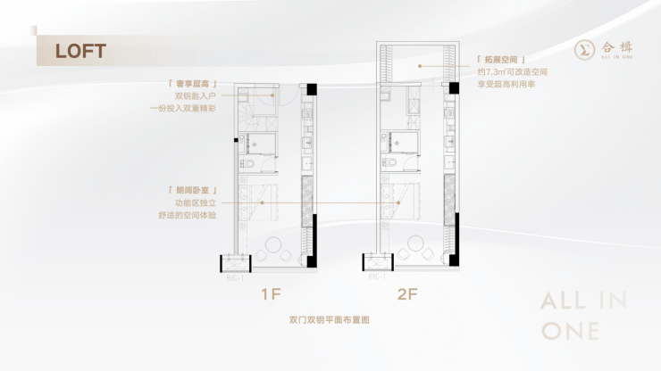 ● 双钥匙LOFT:84套,约5.3米挑高空间,夹层赠送约7.3㎡,双钥匙入户,互不打扰,隐私性强