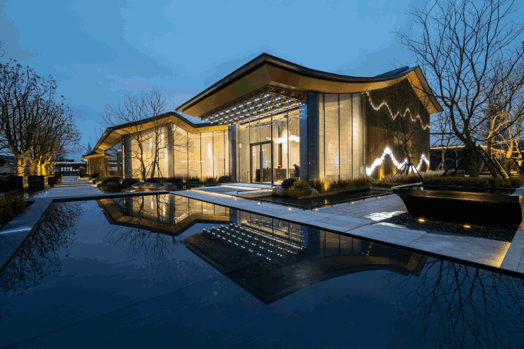 建筑的外立面我们采用了极具中国特色的山水格栅,以光影与仿木质钢结构相结合勾勒出山水剪影,内敛而静谧、自然而隐逸展现的东方气质。以克制的手法及对线条的简约处理,完美的将东方美学与现代艺术相融。