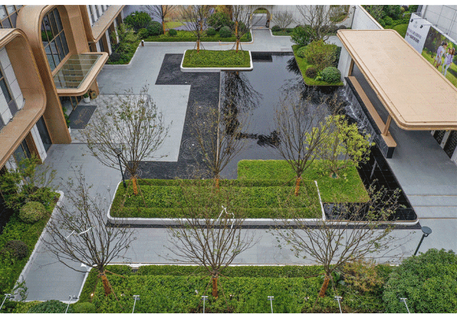 项目住宅区域延续示范区风格的同时,兼顾年轻化与艺术美感,多种绿植构成小区主要框架的道路形态,打破边缘,互相渗透,形成浑然一体的自然风光。