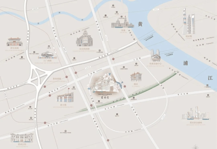 作为上海绝对市心,露香园直线距离人民广场、淮海路、新天地、外滩、豫园等上海市地标性区域均不超过1.5公里,距离陆家嘴直线约2公里。