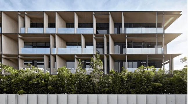 建筑设计:汲取新加坡奢宅 Cluny Park Residence 灵感,叠墅立面甄选仿木纹铝板、银色及灰色铝板,搭配米黄色石材和大面积三玻两腔 LOW-E 玻璃,特别设计向外延申的金属披檐,凸显建筑的层次感
