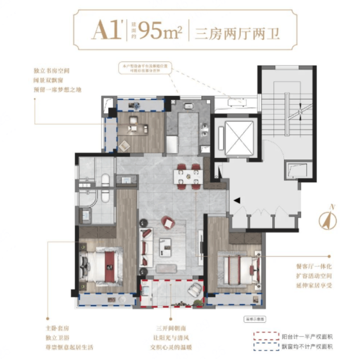 户型面积:规划建筑面积约 90-143㎡三大户型,包括约 90㎡的三居,约 126㎡、143㎡的四居,小三房 + 双卫,空间高利用率;四开间朝南 + 独立家政间;横厅设计 + 高得房率,满足不同家庭结构的需求。