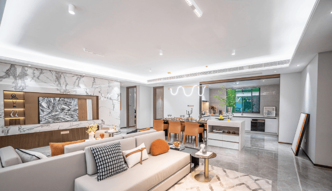 小区规划小区外立面采用公建化规整设计,单元入户门厅为石材 + 铝板幕墙,搭配高窗墙比与大面积玻璃窗,风格简约现代。内部规划了 “一轴 + 一环 + 四园 + 七星空间” 的沉浸式景观,还设有集中绿地、体育活动场地,配备健身器材、小型篮球场等设施,同时有 24 小时保安巡逻,兼顾居住的舒适度与安全性。