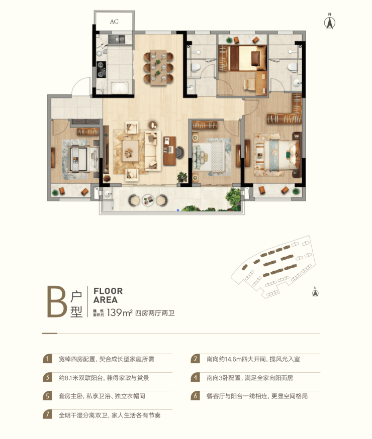 约1.45超低容积率,开篇板块内弥足珍贵的纯正洋房社区,以唐宋山水诗画意象,打造“一园双轴”,开启五进式归家礼序,构筑同质而居的洋房圈层生活。
