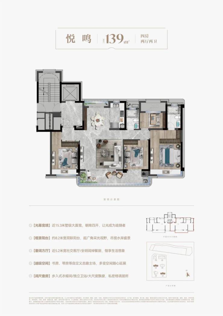 建面约139㎡定制大平层级空间,近15.3米超大面宽设计,让旖旎风光与空间更大程度交织,同时南向约8.2米双联阳台,则营造休闲、惬意生活时光,约5.2米横屏面宽巨厅,亲密交融全明阔绰和高效厨房,让当代人士回归家庭氛围,亦不负奢雅生活的追求,步入式衣帽间/独立卫浴/转角尺度飘窗所呈现的主卧套房,演绎私密格调的居住情境。