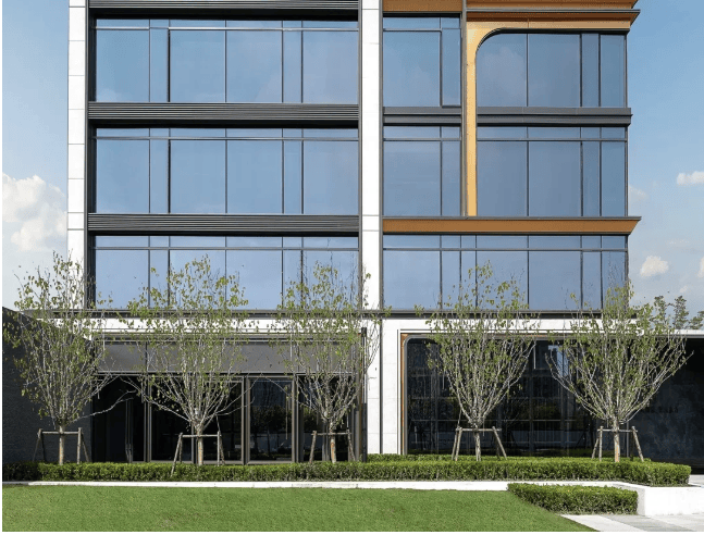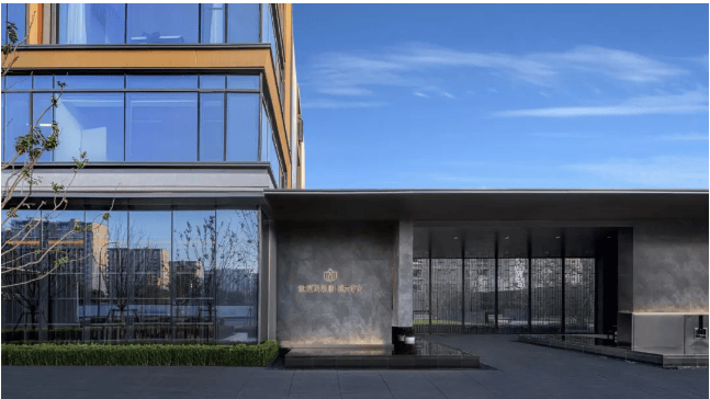 建筑特色:外立面采用现代公建化风格,首创“飞虹屏”设计,错层立面上设计了一湾金色弧线,形成“金弧云境”的独特视觉体验,搭配大面积流云灰玻和极高窗墙比,兼具时尚与科技感。