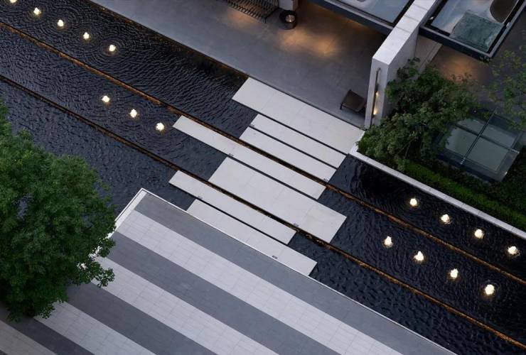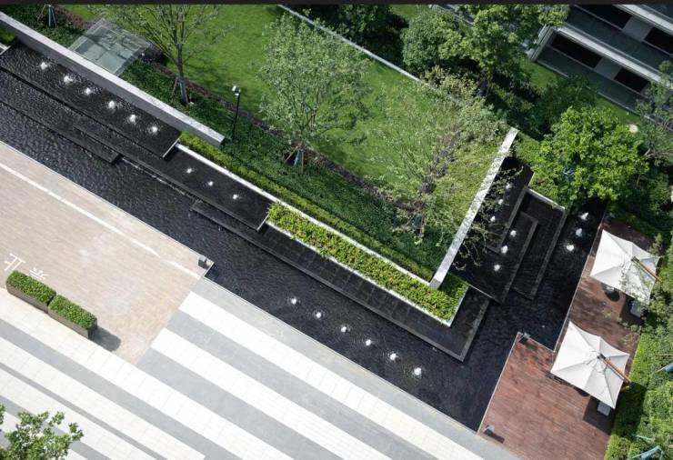 精心打造的景观中轴终于展露真容,中央水景与廊下空间结合得相得益彰,更是灵动有趣。业主可以在廊下空间,或聊天,或社交,或赏景。