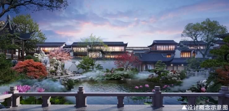 以《桃源图卷》为蓝本,一环五庭三坊七巷,复刻小飞虹、月到风来亭等名园场景,五重归家礼序。