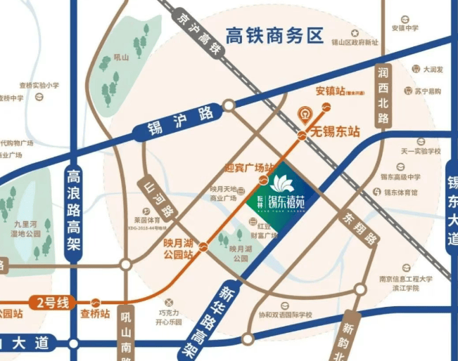 锡东禧苑:地铁 2 号线直达,与 4 号线在映月湖公园站交汇,有高浪路高架、新华路高架、金城路高架等快速道路,30 分钟内无缝对接无锡各个区域,15 分钟快速到达苏南硕放国际机场。