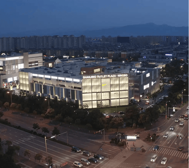 建筑立面采用现代简约风格,以金属线条与大面积玻璃勾勒轻盈质感,与杉井奥特莱斯的时尚氛围相呼应。