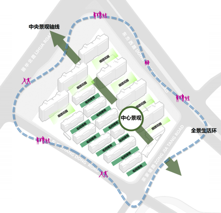 结合住区四周的城市界面,进行合理的总图布局,最终呈现的城市空间舒适惬意。科学的规划布局,为每栋楼都争取到优质的采光、通风、视野资源,营造住区良好舒适的微气候,仪式感中央轴线划分小高层及多层片区,保证南向观景视野最大化,内部景观联系基地周边城市绿化,形成全景生活环线。