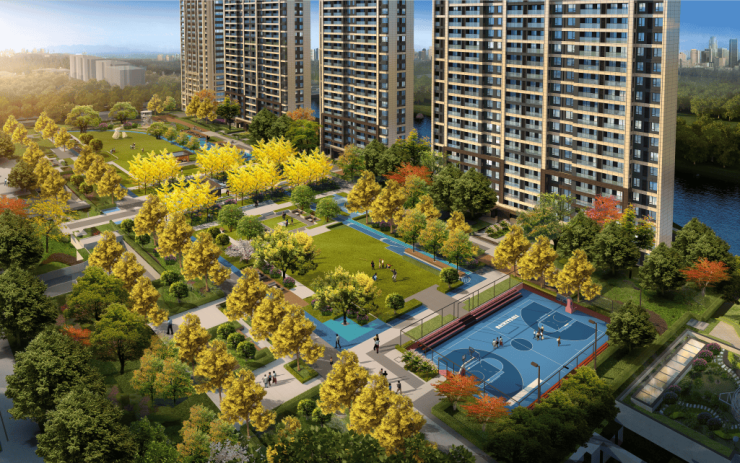 景观设计:汲取东西方园林设计理念,以中式书法艺术为灵感,西方空间布局为肌理,设计活力中轴纵贯园区。园区内设置了儿童游乐场、享棋苑、瑜伽芳草园、体健院等设施,还有精心打造的主题架空层,如儿童游乐区、休息会客区等。