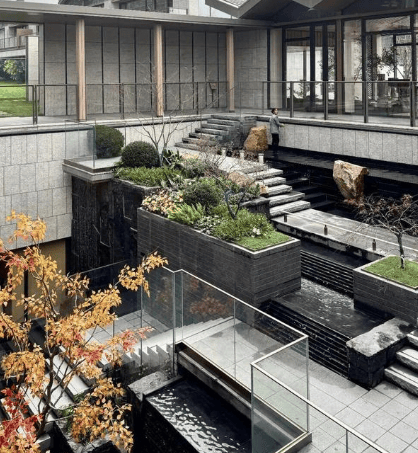 园林约9.3 万㎡,“一环两轴多花园”,中央草坪、滨水步道、全龄活动区,立体绿化、度假感强