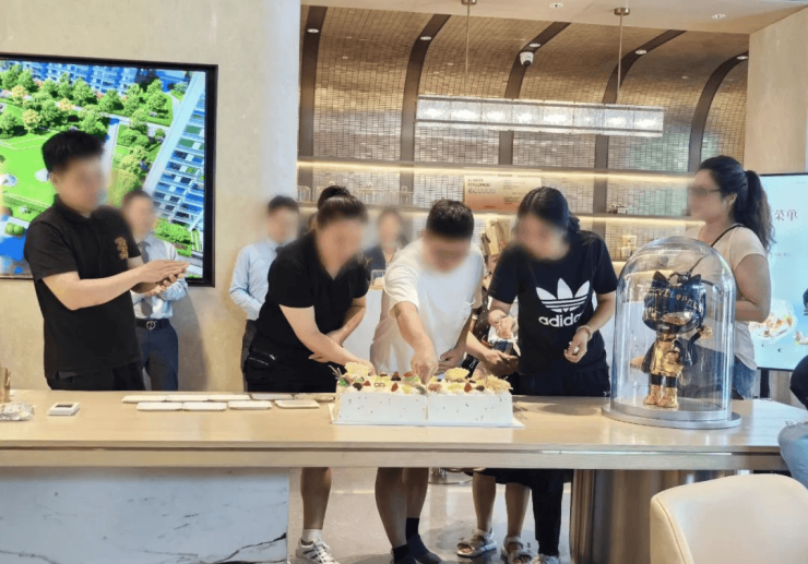 生日会上,虹悦家人与工作人员齐唱生日快乐歌