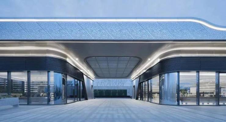 运用材料的搭配和细部节点推敲,营造未来科技感。通过软件模拟与工厂预制相结合,用渐变的穿孔铝板形成逐渐变化的视觉肌理,铝板的排列组合与充满动感的建筑外形相结合,使示范区仿佛在不断的起伏变化。