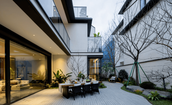 合院产品:建筑面积约 269㎡的合院产品设计有天有地,功能区精细化。一层设置活动区和老人房,二层为休息区,三层是大主卧,夹层为多功能活动室,负一层可宴会宾朋。一层大方厅面积约 57.42㎡,搭配约 45% 超高窗地比;二层有两个南向阳光套房,带有南向景观阳台和北向约 30㎡空中花园;三层超豪华主人空间面积超过 100㎡,配置衣帽间、书房和独立卫生间,大面积落地窗与 L 型大露台相接;负一层明阔夹层空间可实现全采光,形成双首层格局,地下室采用全通透设计,局部层高 5.3 米,可随心配置健身房、棋牌室、影音室、储酒室等。