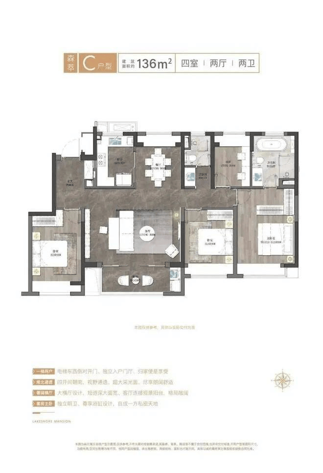 建筑方面,项目11-14层小高层错落分布,一梯两户双开门设计,做到了一梯一户的设计功能,保证了业主较高的居住舒适度,而且建面约100-136㎡户型还可以享受私属电梯厅这等豪宅标配!