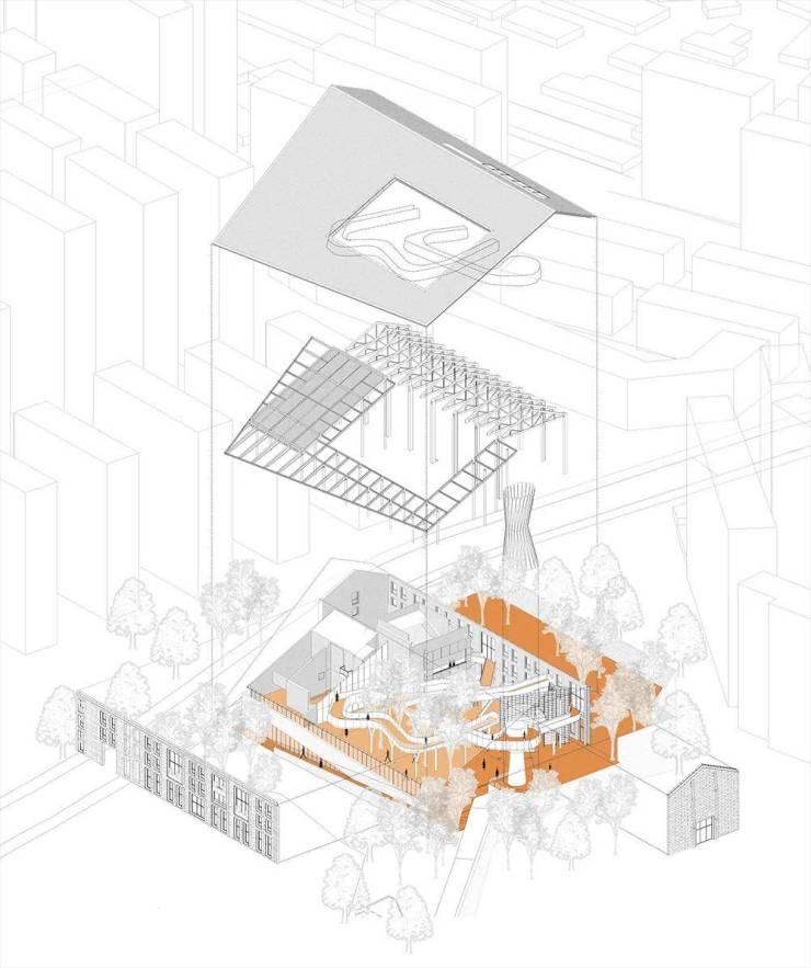 其西侧的水塔作为当地精神堡垒的象征,与飞廊相结合,刻画出基地最根本的水文化基因。
