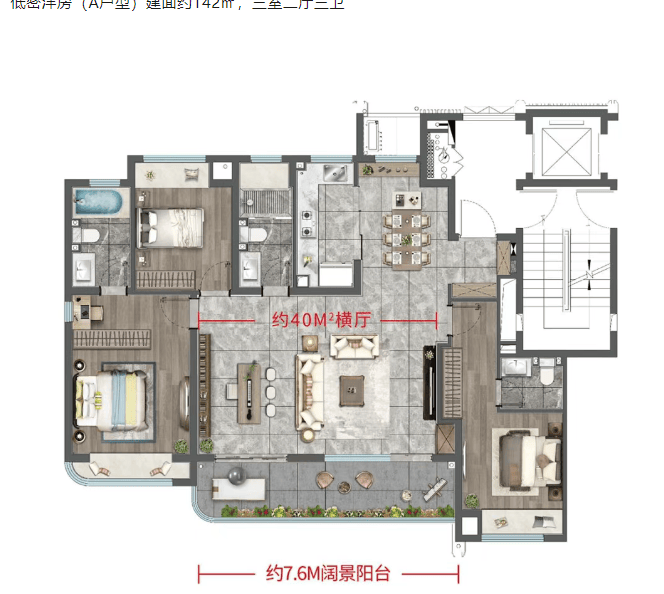 低密洋房(A 户型):建面约 142㎡,三室二厅三卫,南向四开间,专梯入户,有约 40㎡超大横厅和约 7.6 米阔尺廊台。