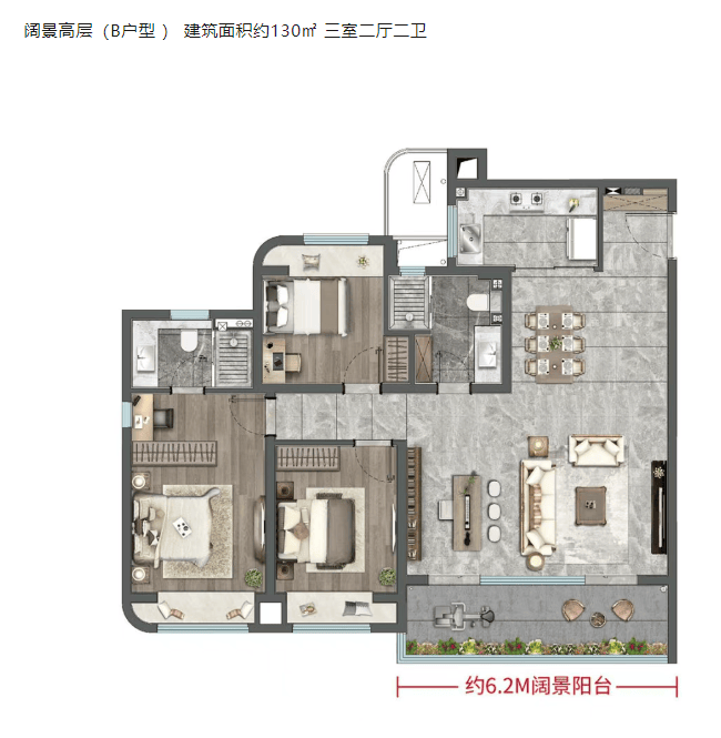 阔景高层(B 户型):建筑面积约 130㎡,三室二厅二卫,四开间朝南,餐客双厅一体联通约 6.2 米景观阳台。