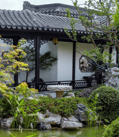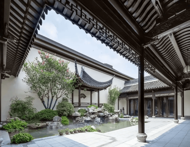 纯正王府中式风格,主入口 “朝晖门” 宽 31 米、高 10 米,气势恢宏;立面采用葡萄牙米黄石材 + 铝板 + 大面积玻璃,搭配歇山顶、飞檐戗角、万字纹花窗;园林特邀香山帮匠人打造,以苏州网师园为蓝本,构建 “一轴两环九巷十八景”,包含曲水流觞、月洞门、风雨连廊、四水归堂等苏式园林符号;社区做了归家三进仪制(一进朝晖门、二进心远堂、三进清晖园),圈层纯粹,私密性极强。