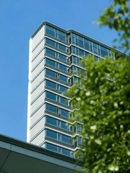 建筑风格:建筑立面采用三玻两腔玻璃与全铝板材质相结合,窗墙比高,视觉通透且辨识度高。在多个纵向条线上采用大面积折角铝板设计,不仅提升建筑美观度,工艺复杂程度和成本也更高 。