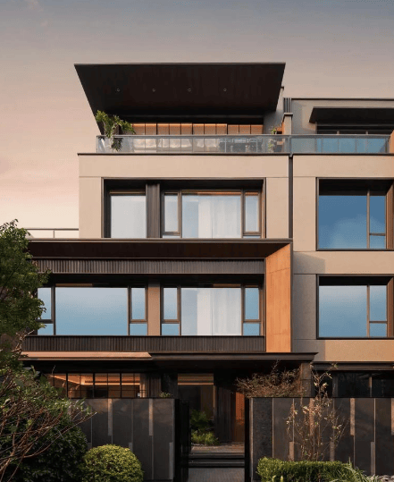 建筑特色:项目三面环水,打造包含墅境洋房、联排院墅、双拼排屋等多种业态的低密住区。建筑取法绍兴漆墙瓦黛等传统元素,搭配大尺度东方飘檐与质感铝板木纹盒子结构,像建面约 275㎡的台门大宅,还有超 58% 窗墙比与约 10 米南向开间,增强采光与通透性。同时以三进制院落、泗水归庭布局等,还原绍兴高门大宅的礼序感。