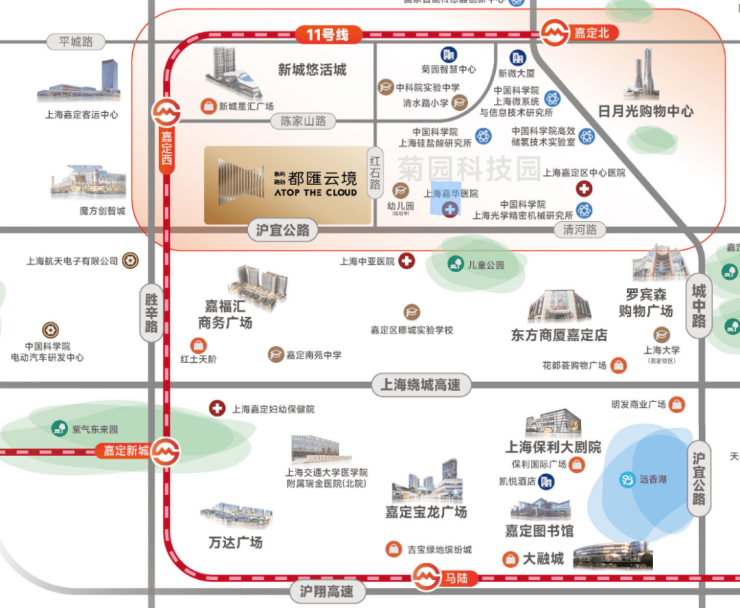 交通方面:项目距离轨道交通11号线嘉定西站直线400米左右,附近还有嘉定客运中心,交通便捷。另外,项目临近沪宜公路、距离沈海高速约1.5公里,上海绕城高速约3.5公里,自驾出行也十分便捷。
