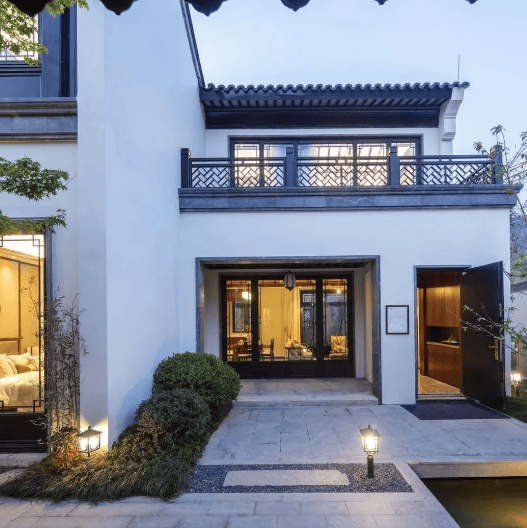 建筑风格:采用纯粹的中式建筑风格,黑、白、灰三种色彩排列组合,马头墙、小青瓦等元素交融,依山就势,黛瓦白墙,雕镂飞檐,景观园林演绎国风水墨的诗情画意,与溪口山水的古典秀美神形相契。