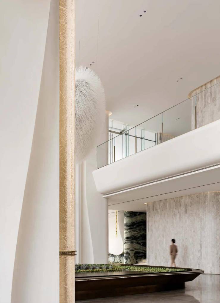 挑空区以空灵的浅色调重塑建筑元素,无限延伸的通道,柔和的弧形棱角,如同蜿蜒的河流,通过不同围合的弧形空间,以一种更具情感色彩的方式,俯仰之间皆是纯粹。