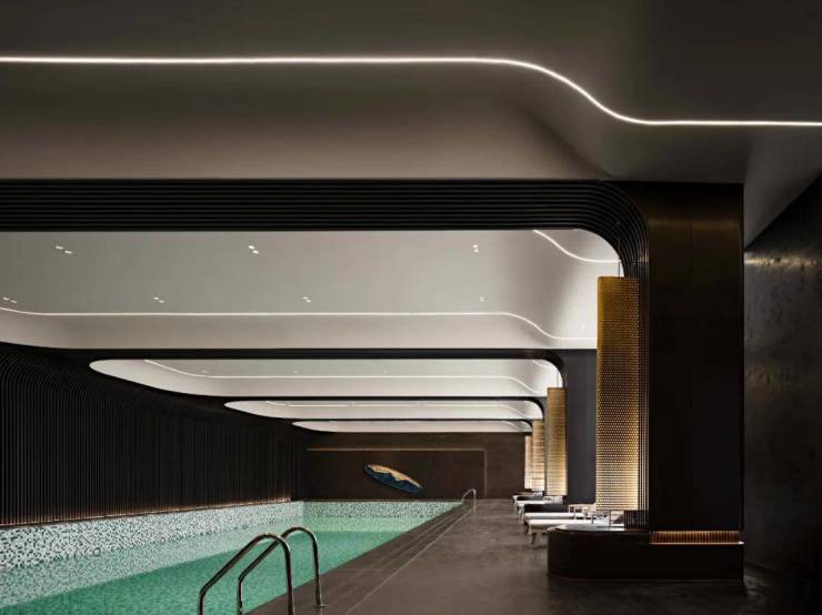 泳池柔和的曲线造型,贴合水的律动,打造亲水空间,空间整体的色调呈现高级感,镜面使空间得以延伸,灵魂不再被空间所束缚,挥洒汗水,释放所有的压力与负担,体验前所未有的轻松。