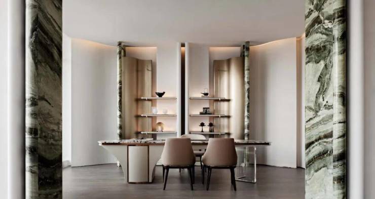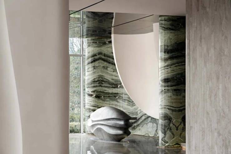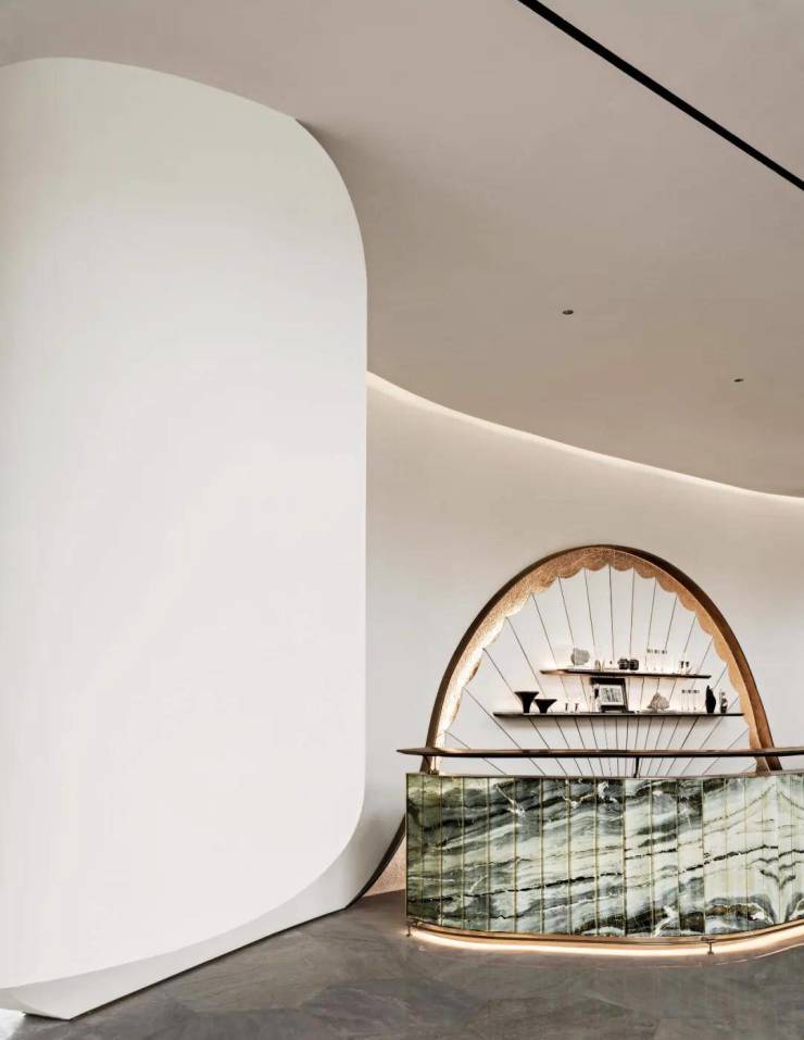 倚山临湖的无锡,“水”是这座城市的灵魂,浸润着不断传承的城市基因。“绿松石”奢石以深邃的质感和奢雅的格调,赋予空间灵动柔和的自然之韵。银色金属接待台呈现出现代主义的抽象与纯粹,搭配圆弧形白色饰面艺术装置,描绘出“太湖明珠”的灿烂图景。