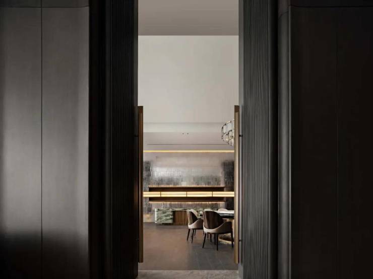 建筑提取黄金年代豪华公寓圆角形态母题,室内延续了风华时代的辉煌。透过金属的细节与几何元素在空间中的运用,探讨一场对城市格局与文化传承的思考,重塑人们的生活方式,营造建筑与自然共融新生的格局。