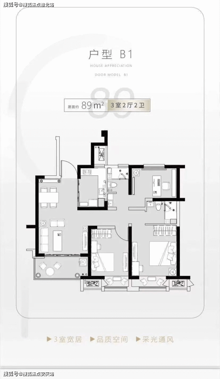 在约89m²空间尺度内,罕有的做到了3房两卫格局,并且实现了南向宽幕阳台,同时南向两个房间各拥有了大飘窗设计,更难能可贵的是在这种户型下还同时拥有两卫,这是众多小面积中罕有的布局,也是建滔设计师对众多家庭的一次住房革新。
