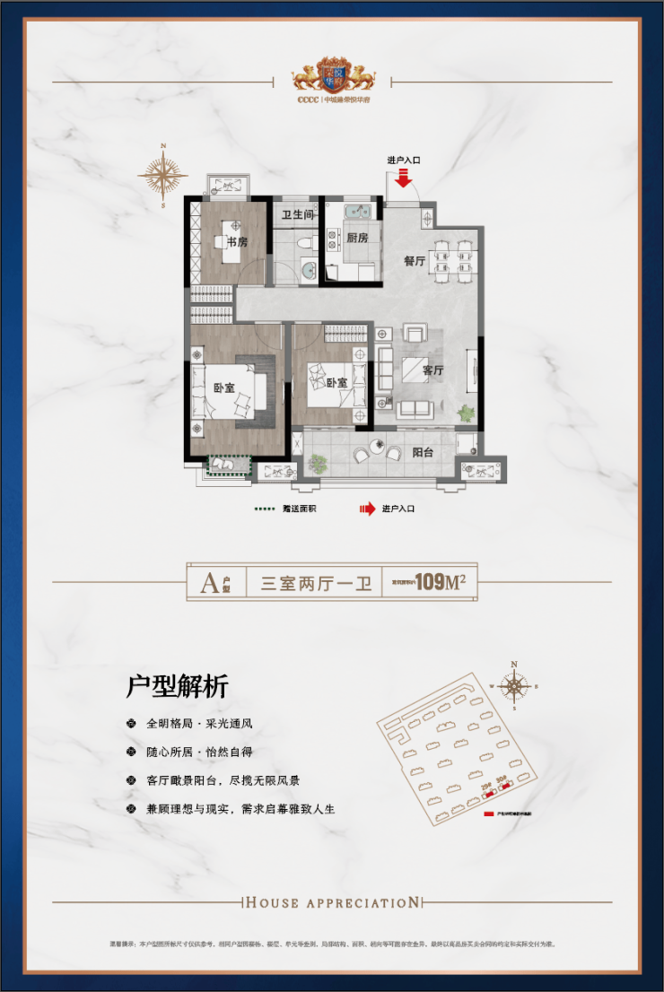 以项目明星产品建面约109㎡的户型为例,该户型南向三开间,户型方正、郎阔,双阳台设计,采光、通风两不误。
