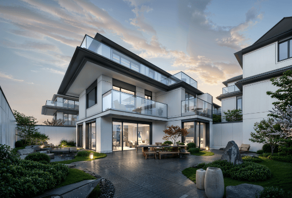 合院产品:建筑面积约 269㎡的合院产品设计有天有地,功能区精细化。一层设置活动区和老人房,二层为休息区,三层是大主卧,夹层为多功能活动室,负一层可宴会宾朋。一层大方厅面积约 57.42㎡,搭配约 45% 超高窗地比;二层有两个南向阳光套房,带有南向景观阳台和北向约 30㎡空中花园;三层超豪华主人空间面积超过 100㎡,配置衣帽间、书房和独立卫生间,大面积落地窗与 L 型大露台相接;负一层明阔夹层空间可实现全采光,形成双首层格局,地下室采用全通透设计,局部层高 5.3 米,可随心配置健身房、棋牌室、影音室、储酒室等。