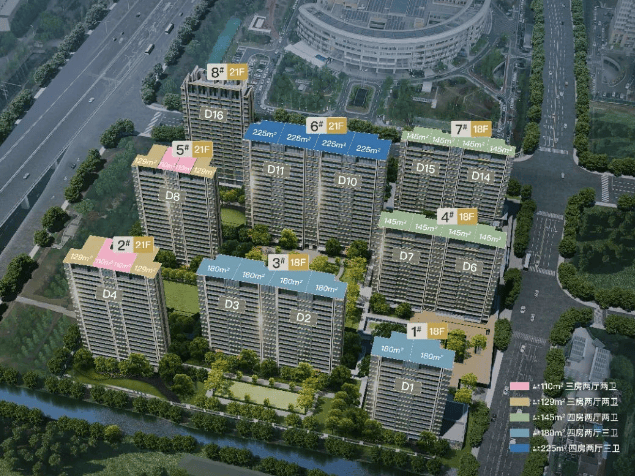 楼栋规划:项目打造 8 幢 18-21 层美学住区,共 463 户。小区规划 7 栋小高层和 1 栋人才房以及 9000㎡外围商业街。