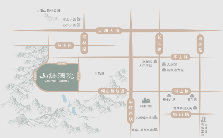 项目所处板块在地理位置上处于高新区中心位置,东有狮山核心CBD西有科技城,共享两个区域优质配套。以周边山水自然风光为基础,何山隧道为纽带,连通进一步项目与狮山片区。实现自然风光 — 项目 — 都市生活链条,构建多元生活场景。