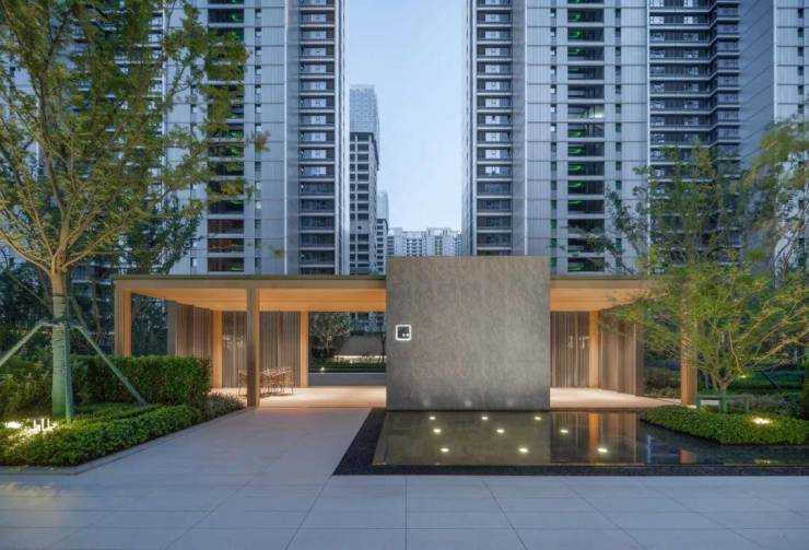在北侧公寓主入口,礼奢气质的入口大门隔绝了都市的繁杂,两侧不对称造型树与迎宾水景,传达精致、贵气的感受,营造酒店式入口的体验感。