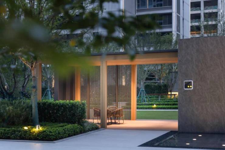 在舒氧的宅间花园,结合场地气质与调性,我们将景墙与自然相融合,形成不同的休闲空间,让居者感受被林荫包裹的自然休闲氛围。