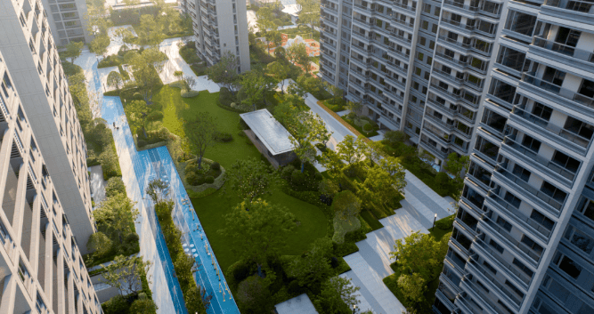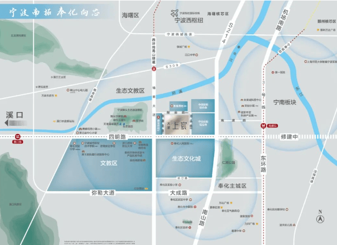 生态配套:项目周边生态环境优越,毗邻奉化城市绿地公园、县江滨水带,周边 3km 范围内有 23 个公园,靠近国际 5A 级风景名胜区滕头生态旅游风景区和溪口旅游景区等生态胜地,空气质量优异,环境优美34。