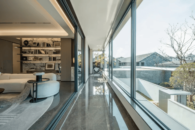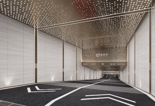 归家动线设计:地上是霸气的星级酒店式门头,巨大的挑檐和高级的石材,充斥着高贵又庄严的气质。单元门厅使用大理石背景墙、灰白色系岩板、无主灯吊顶进行装饰,极尽轻奢感。地下是流行的星空顶地库,地下单元入户也装修得十分奢华,氛围感拉满的光影,彰显了项目的质感与调性。