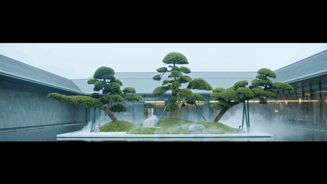 内院中心是三棵精心裁剪的巨大松树盆景,白色石台作为基底,使盆景宛若“漂浮”于水面之上。行走在回廊之下,随着视线的移动,松、水、影在曲折回转间呈现不同的景致。
