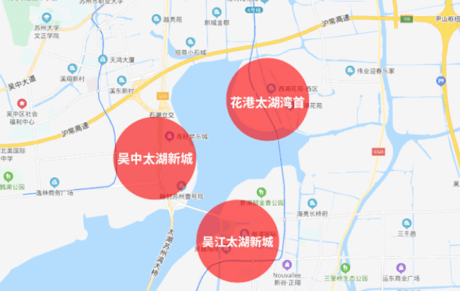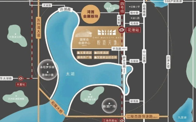从位置上来看,悦揽天地置立于东太湖畔,临近4号线花港站。项目以西为吴中太湖新城,以南为吴江太湖新城,同在苏州湾内,而中粮悦揽天地则位于苏州湾最北端,只是这里跟吴江主城之间隔了个苏州湾,跟松陵之间隔了一片工业区,所以是一个相对独立的组团。