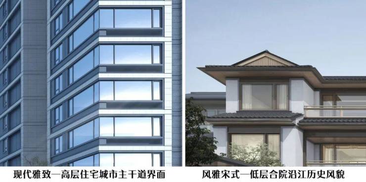 在建筑形态设计上采用现代风格和风雅宋式的两种建筑风格分别对高层住宅和低层合院进行诠释。