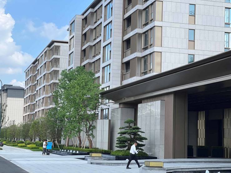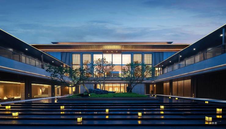 外立面采用全石材干挂 + 香槟色金属线条,质感耐旧;社区遵循中轴对称礼序,种植百年罗汉松、乌桕、榉树等成树,打造浓荫园林;约 5000㎡会所提供高端社交与休闲功能。