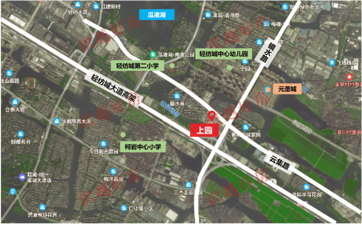 上园位于瓜渚湖板块——柯桥区镜水路与云集路交叉口,近享约 2万方商业综合体元垄天空MALL(在建),轻纺城中心幼儿园、轻纺城第二小学、鲁迅外国语学院等教育资源环伺,居住氛围浓厚。