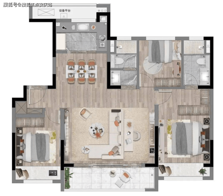 建面约118㎡三房两厅两卫的户型, 将原本应该是140㎡豪宅元素全部放入其中,简直是一次空间格局降维打击。