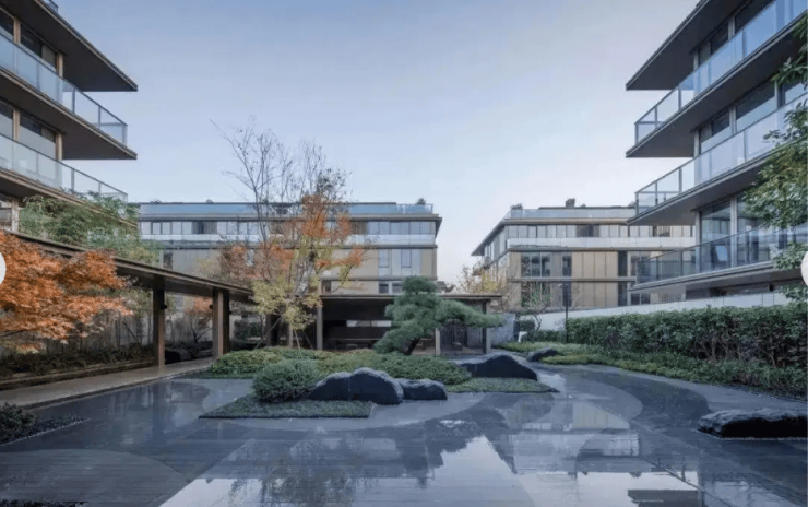 建筑规划:项目容积率仅 1.1,是典型的低密住区 。总共规划 286 户,营造出静谧、舒适的居住氛围,避免了高密度社区的嘈杂与拥挤。建筑类型主打联排别墅,建筑风格融合宋韵美学,以现代建筑语言对传统宋式元素进行创新转译。例如,借鉴宋代建筑的 “轻灵屋檐”,简化戗角飞檐,用利落线条勾勒出独特轮廓;打造 “金镶玉” 立面,以玉润玻璃搭配香槟色金属线条,尽显高贵典雅,呈现现代形制的东方韵律。