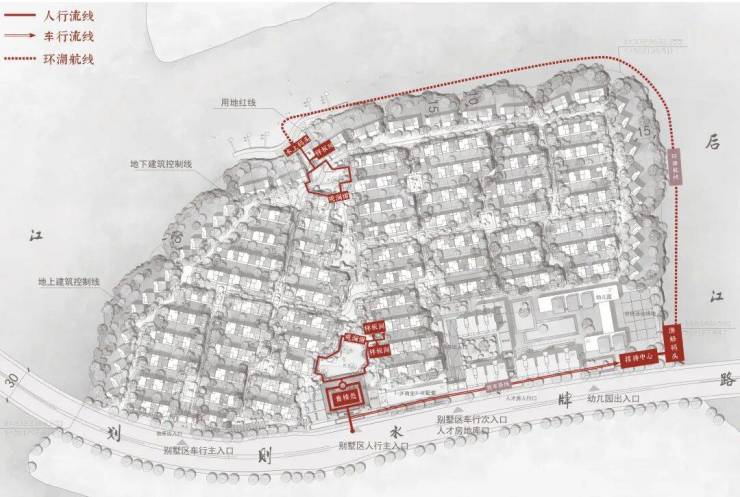 整体划分为两个组团,组团间营建联动城市界面与滨湖水景的景观中轴,步移景异,空间灵动。
